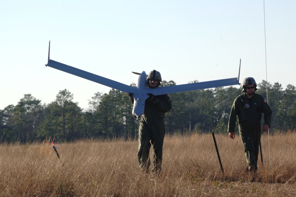 The Scan Eagle small unmanned aircraft system takes flight here at the Eglin Air Force Base test range Feb. 7. It is a portable system which features three Air vehicles, a ground control station, a remote video terminal, and a launch and recovery system. (U.S. Air Force Photo/ Master Sgt. Buffy Galbraith)