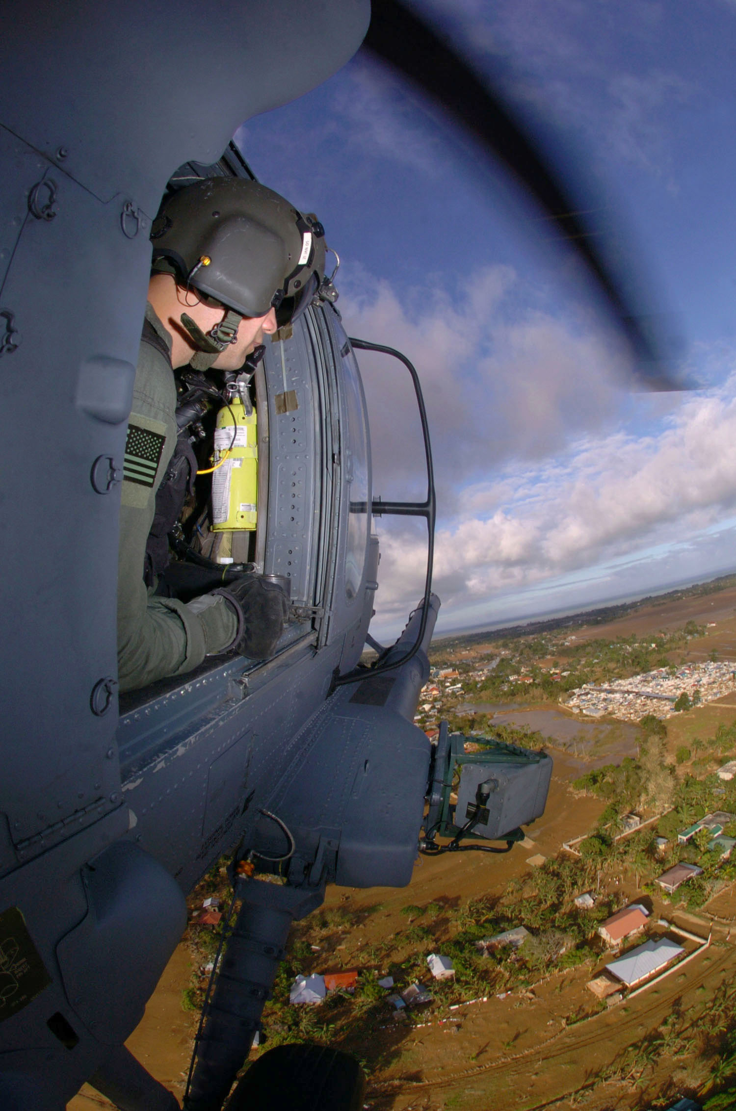 QUEZON PROVINCE, Philippines - Tech. Sgt. James Karmann surveys the landing zone before landing at the town of Real during typhoon relief operations here. The HH-60 Pave Hawk helicopter delivered food and supplies to the distribution center. U.S. Air Force and Marine helicopters have delivered more than 390,000 pounds of relief goods to the stricken areas. Sergeant Karmann is a helicopter flight engineer from the 33rd Rescue Squadron at Kadena Air Base, Japan. (U.S. Air Force photo by Master Sgt. Val Gempis)