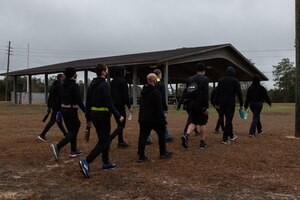 Trainees with the 919th Special Operations Wing Development and Training Flight, march to the track at Duke Field, Florida, Feb. 7, 2021. The D&TF is a delayed entry program that gives new members of the Air Force Reserve the opportunity to learn, develop, and cultivate the basic skills of being an